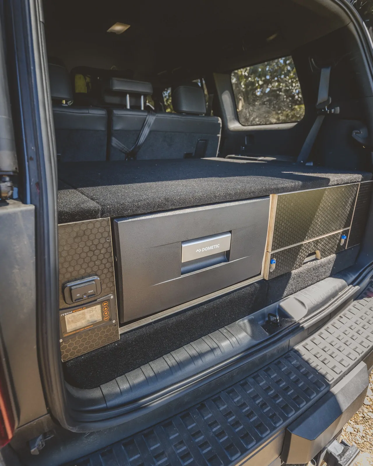 Add functionality with our custom Prado Drawer System, built to fit seamlessly on top of the Free Roam false floor. The dual-drawer configuration includes a stainless-steel pull-out table and top surfaces finished in factory-look carpet. A dedicated electrical allocation behind the left-hand drawer accommodates an optional Dometic 30 L drawer fridge, or you can select a replacement storage drawer if you prefer a full-width system.