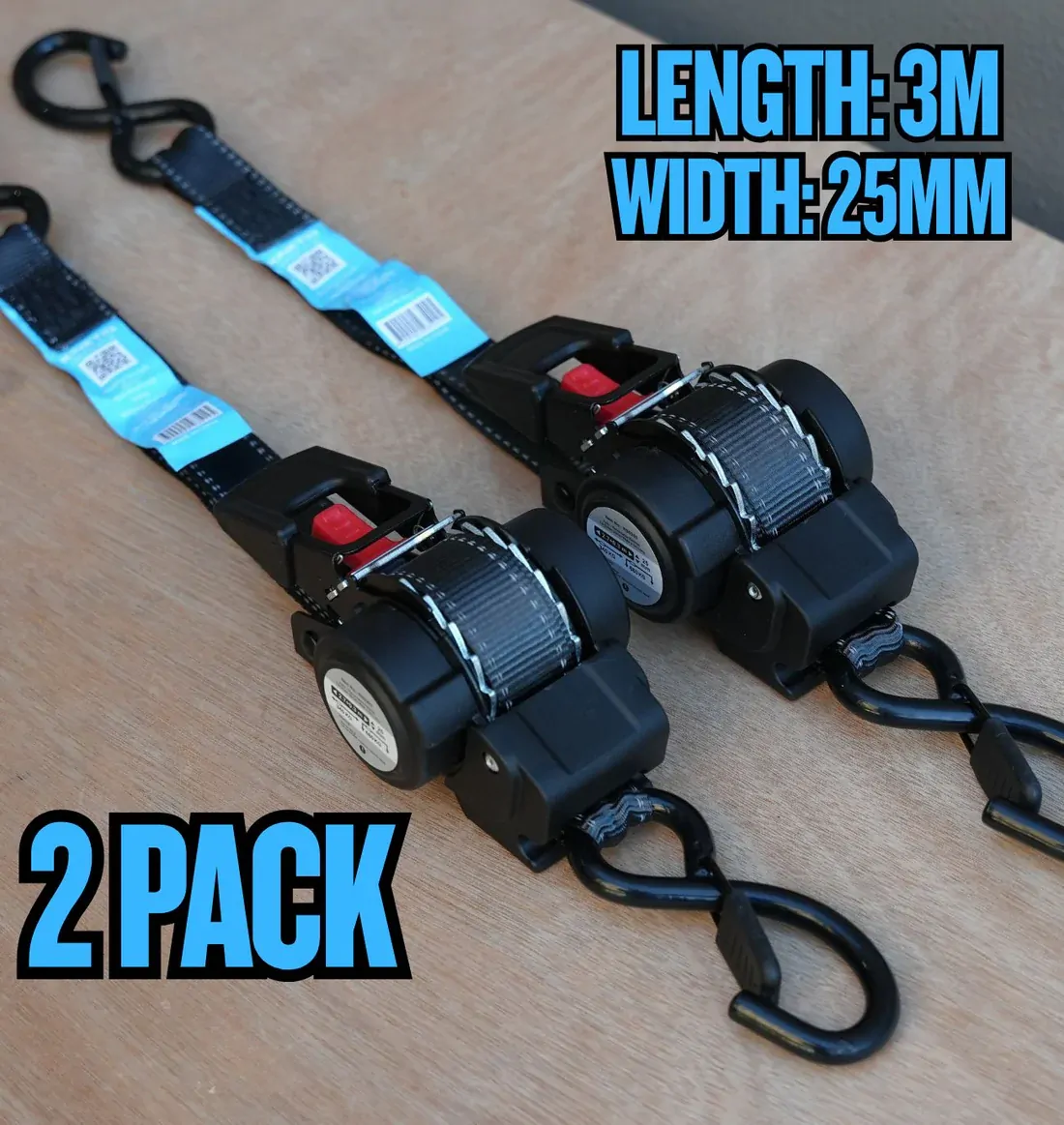 (Set of 2)- KINETIQ Automatic Retractable Ratchet Strap - 3m Length (25mm Width)