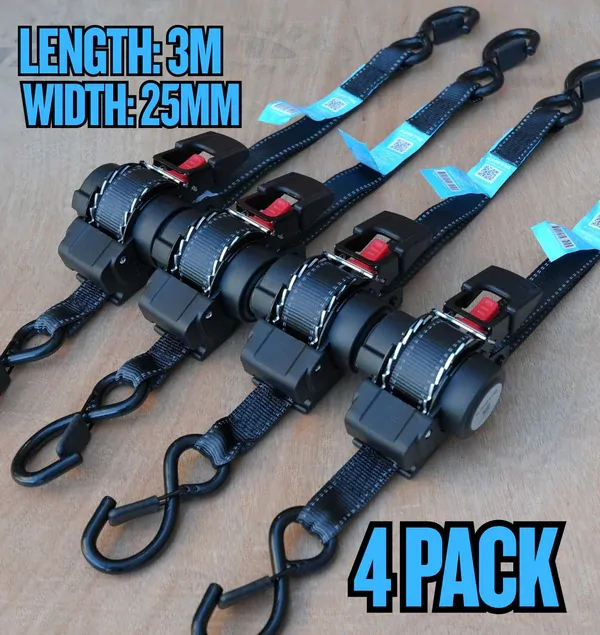 (Set of 4)- KINETIQ Automatic Retractable Ratchet Strap - 3m Length (25mm Width)